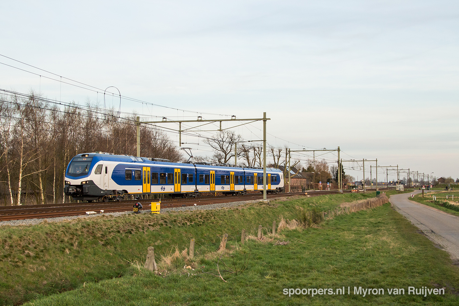 Hier rijdt het treinstel de derde slag en is van Venlo op weg naar Helmond. Over enkele ogenblikken zal het treinstel station Horst-Sevenum passeren. Naast de eerder genoemde problemen heeft het treinstel ook lichte schade opgelopen tijdens deze eerste rit. Wanneer je naar het bovenste frontsein kijkt, zie je dat het glas gebroken is. Dit komt doordat er een vogel tijdens een eerdere testrit op de dag was geraakt.